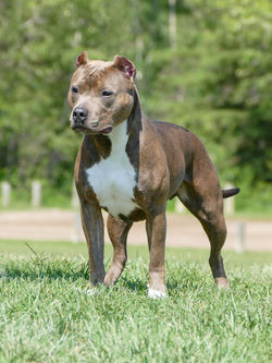 Aloy is a puppy from an outside breeding we did with Woodsie and Hazel owned by Benchmark Bullies. She was fondly referred to as "Lotus" throughout her time with BMB as they had a car theme to pay tribute to Hazel, who's registered name is NBK Maserati. Hazel is a UKC Grand Champion and is a super correct, well put together dog. I knew I just had to hold on to a puppy from this breeding! Aloy was the clear winner for what we were looking for out of this pairing and we are super excited to see what the future has in store for her! She has been placed in a wonderful Co-Own home in central Alberta.
