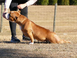 Tito, much like his parents, has a lot of enthusiasm but is not overly motivated to be a high level sport dog. However, if you are wanting a companion that is happy to participate and dabble in things, he is your guy! He has done formal training in rally obedience, weight pull, and scent detection. He was exposed to gerbils for barn hunt and did not show much interest as he really has no prey drive or desire to find/chase small animals - though I'm sure we could teach him to alert on the odor for treats if his owner has a strong desire to be involved in it. We will continue to work on life skills and sporty foundations with him as long as we have him, with a strong focus on rally obedience, weight pull and scent detection.